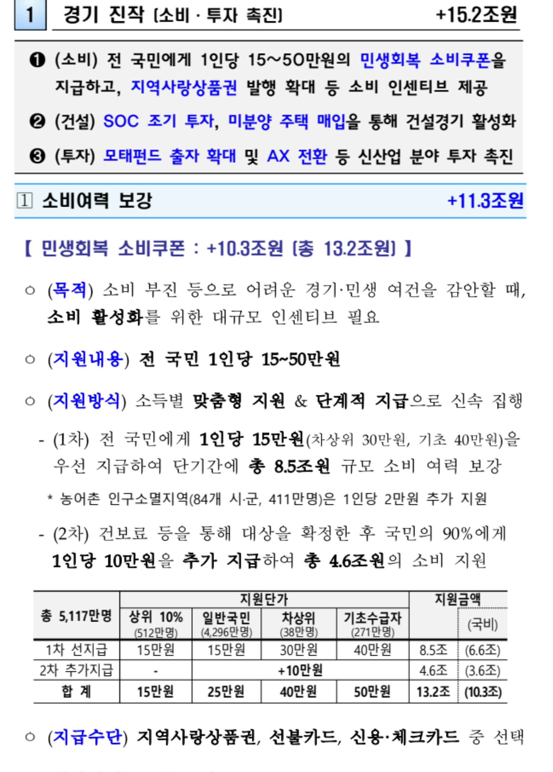 13조 원 규모 추경을 통해 국민에게 1인당 40만 원 소비쿠폰 지급