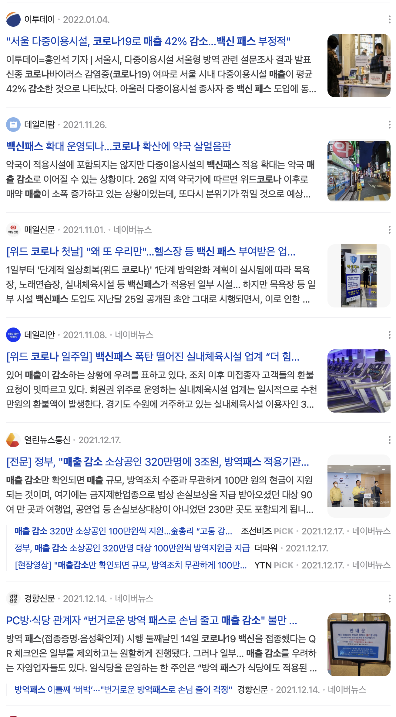 방역패스로 손님이 줄어서 매출이 감소해서 식당은 대출을 받아서 월세를 내기도 했으며 이를 감당하지 못해 페업을 하기도 했다