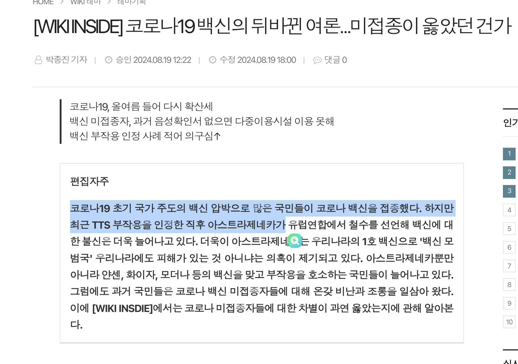 2024년 코로나 백신에 대한 부작용을 아스트라제네카 백신 제조사에서 부작용을 인정하여 철수를 했다.