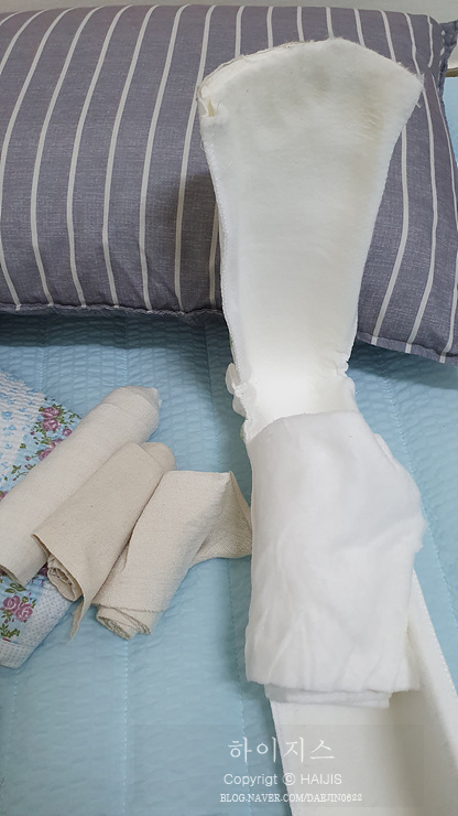 3. 솜 붕대로 부위를 감은 후 그 위로 석고붕대를 감아주고 좌우로 눌러주면서 고정시켜주면 깁스의 고정이 끝난다.