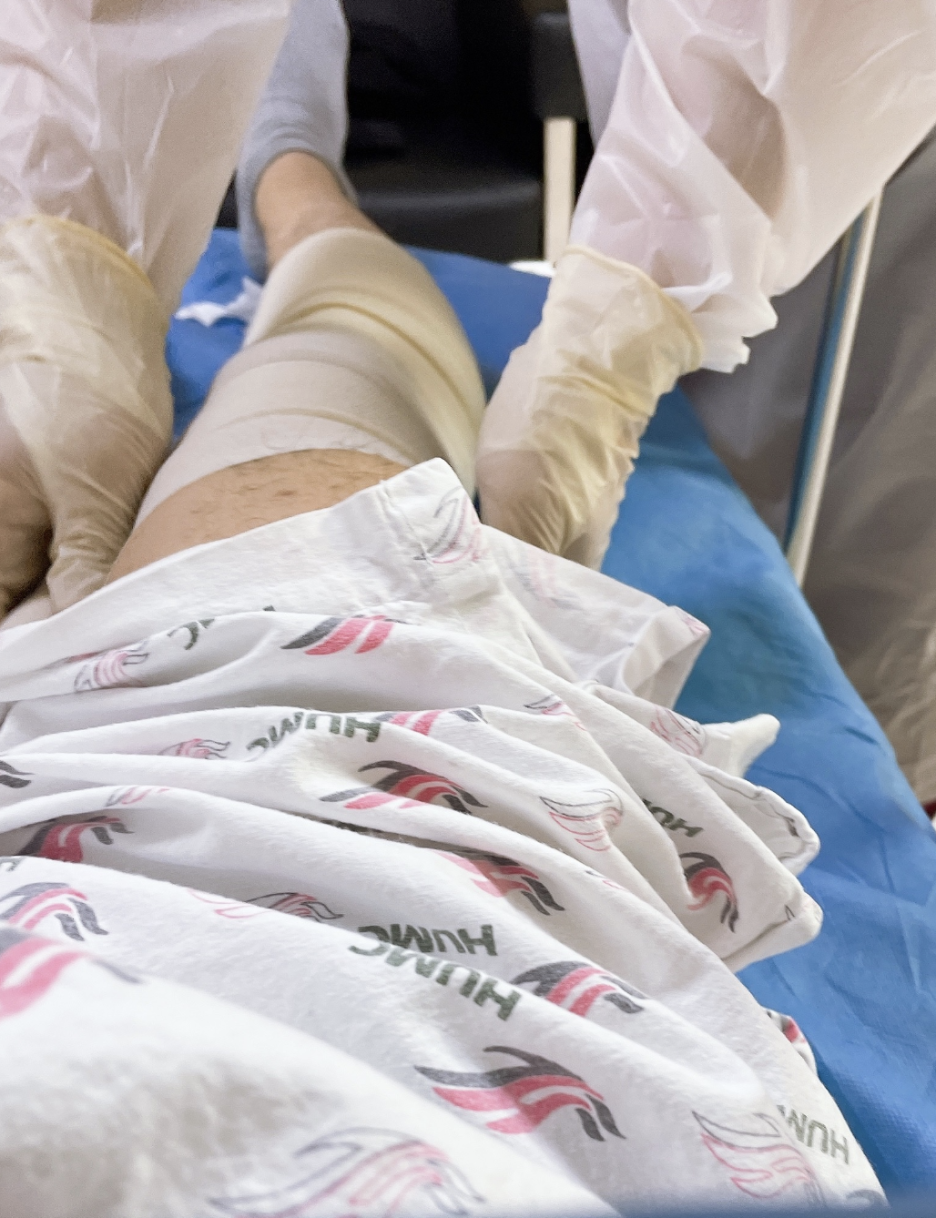 필요에 따라 다리 반깁스(Splint)의 몰딩으로 환부에 맞게 제작이 완료된 후에는