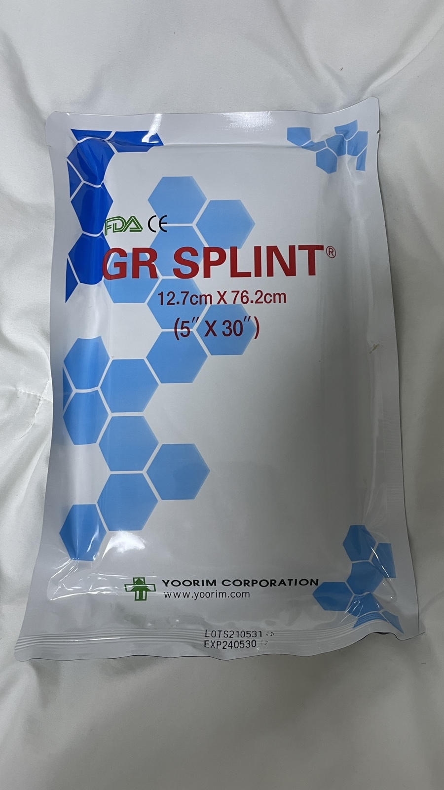 Splint의 사용방법은 진공포장된 스프린트를 개봉하여 물을 적시고 스프린트의 물을 짜내고 환부의 고정하면