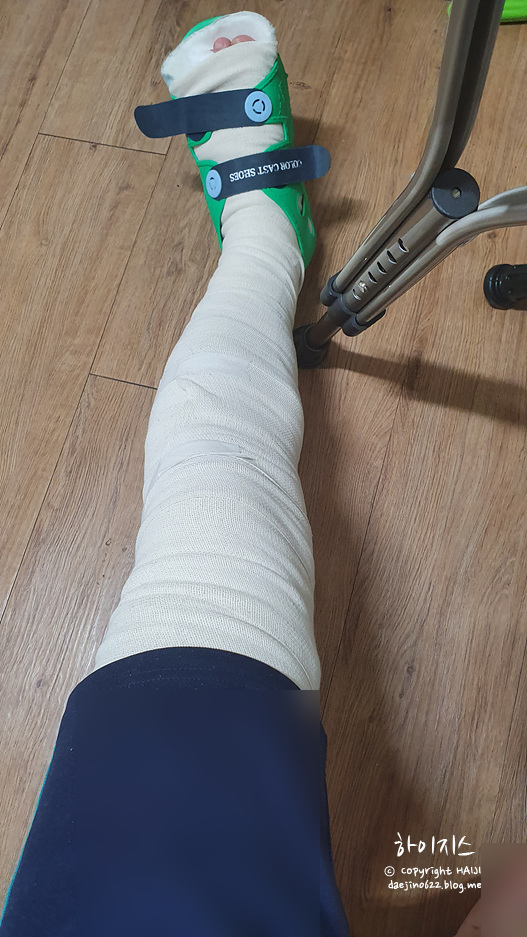 깁스(통깁스)는 석고를 이용하여 다리 전체가 고정되는데 이게깁스다.